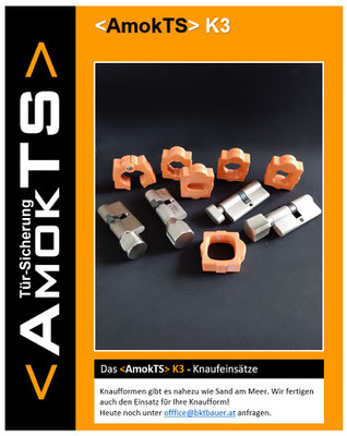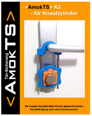 K3 wurde für Knaufzylinder entwickelt, wobei die Türsicherung an die Kunden-Knaufform angepasst werden kann (= variabler oranger Einsatz).