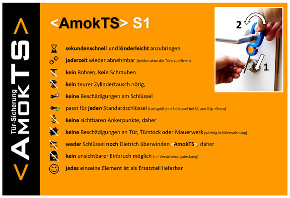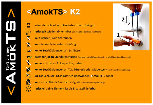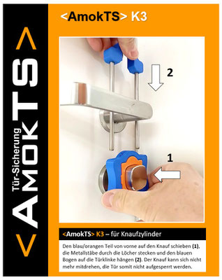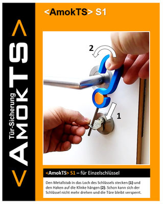 Wenn es ein Geheimnis gibt, dann ist es die Einfachheit sowie die rasche und kinderleichte Anwendung. <AmokTS> steht für "Sicherheit in Sekunden", denn es sorgt im Handumdrehen dafür, dass Türen von außen nicht mehr entsperrt werden können - weder mit einem